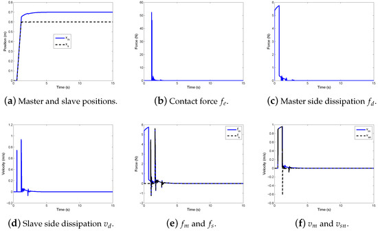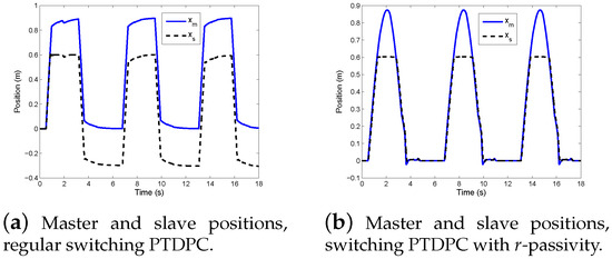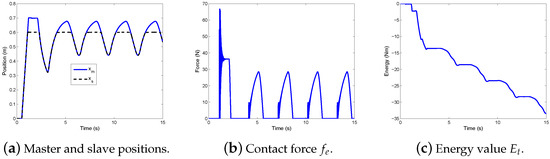 Set 1: The first test was performed with switching PTDPC but without position drift compensation. The parameters for the experiment were chosen exactly the same as in the simulations. However, the environmental force was simulated as where and are the velocity and position of the slave.