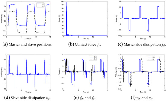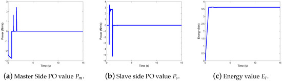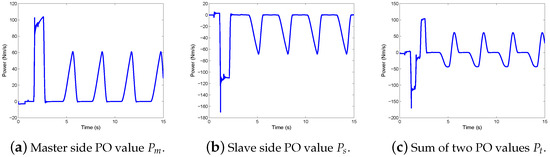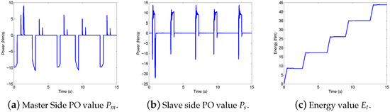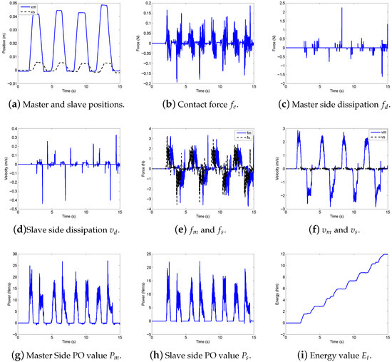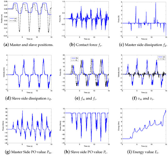 Figure 14g,h, respectively. It can be noted that whenever the passivity observers observe a negative power value, damping is injected in the system by the passivity controllers to maintain the passivity of the teleoperator. The positive energy values in