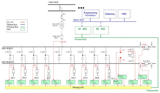 The capabilities described above have common general features with a typical IT environment. However, similar to the IT environment, the topology viewed by the developers of IEC 62351-7 employs communications protocols not found in typical IT environments. These include serial protocols, such as distributed network protocol 3 (DNP3), Modbus, and additional protocols such as IEC 61850, used for electrical substation automation. A typical 154 kV substation using the IEC 61850 standard in Korea [13] has been constructed, as shown in a single line diagram of Figure 1. A substation consists of physical field devices of the substation switchyard and remote digital systems of the control center. In Figure 1, a physical substation switchyard is depicted by a black solid line, and IEDs and digital control centers are depicted by a green and blue dotted line, respectively. The electronic current transformer (CT) and power voltage transformer (PT) are depicted by a red line. These electronic signals are mapped with digital output, using a merging unit shown as yellow box in Figure 1. Then, the substation system transmits the process measurements to digital protection IEDs in a process bus. A detailed symbolic notation for circuit breakers, transformers, process bus, station bus, switches, and feeders can be found in [14].