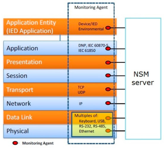 In addition to typical IED-to-IED information exchange, such as remote protection and control activities, networks supporting critical infrastructure may also require IED NSM capabilities. Information supporting NSM may be available from multiple cyber–physical sources within the network, as depicted with red dotted points of the cyber and physical system in Figure 2.