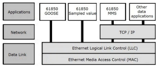 The IEC 61850 protocol and function commands are used widely for the standard communication between heterogeneous smart grid systems, such as SCADA, micro-grids, electric vehicle charging infrastructure, demand response (DR), and DERs. The IEC 61850 protocol stack depicted in Figure 4 requires thorough analysis to ensure secure implementation when a new system is deployed. The critical nature of protection switching within substations was one of the principal challenges addressed in the development of IEC 61850 network protocols and related network design guidelines. A major development was the definition of GOOSE. GOOSE messages have a direct mapping into the Ethernet, bypassing the overhead of TCP/IP protocols. GOOSE messages are recognized by compliant Ethernet switches to have preemptive priority over network traffic. Within five milliseconds of a critical system event, GOOSE messages are required to multicast to other registered IEDs attached to the Ethernet-based network, replacing earlier generation station bus-type communications.