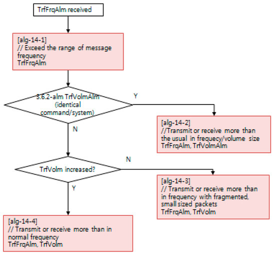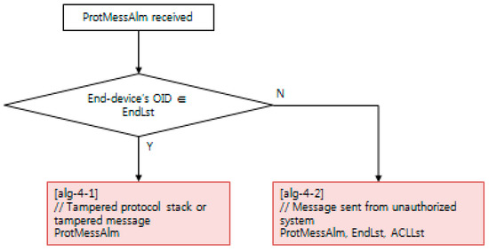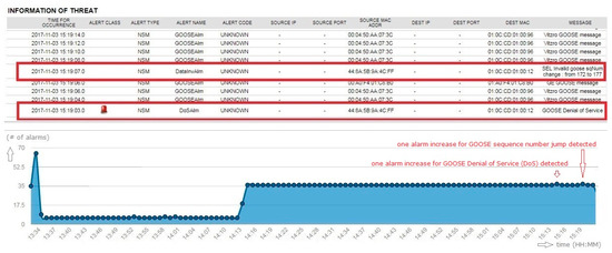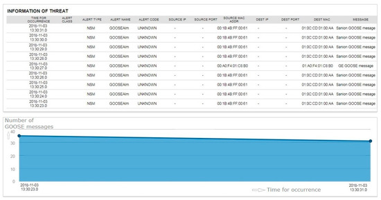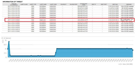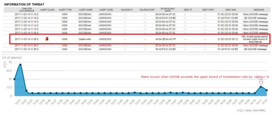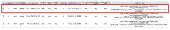 The rate change was detected by the preprocessor rule (set in Figure 18) derived from IED management and the analysis module with alerting enabled on the invalid GOOSE period. The rule set in Figure 18 is an example detection rule for GOOSE timing monitoring. The rule engine is based on a snort, open source-based rule set [12], with the extension to add source/destination MAC address and source/destination application ID, as well as rule options. The rule options consist of the alarm message specified for IEC 61850 command, NSM object name, and NSM alarm states. In case of an invalid GOOSE period alarm, the NSM object name is defined as “DataInvAlm”. The NSM alarm state has a unique identification, numbered 00010490. GOOSE was requested once, with GOOSE dataset “SEL_351_1CFG/LLN0$GO$GPub01” on every 1-second (1000 milliseconds) time interval, with system identification number (SID) as 6020001. The rule feature set defined in this literature was introduced in Table 1.