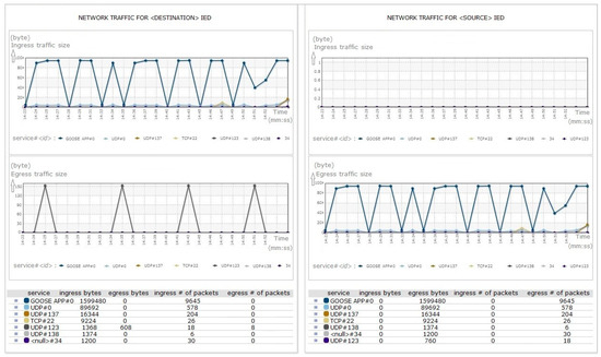 In the case of analysis on GOOSE transmissions from one source IED to another destination IED, as depicted in Figure 7, the network pattern of the destination IED’s ingress traffics are the same with the source IED’s egress traffics. They are identical with regard to the traffic size and the number of packets, regardless of the time. However, the destination IED’s egress traffics may differ with the source IED’s ingress traffics. There is no traffic allowed on a local network back towards the source IED, although the destination IED attempts to transmit egress traffics based on destination IED’s own setting.