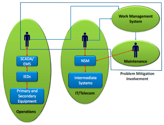 The fence or gate surrounding the actual substation is monitored and set to the appropriate MIB element if the barrier is crossed. It would then notify the substation engineering team about the physical intrusion, and be cleared when the intrusion has been mitigated. Figure 8 illustrates the interaction with both the operation and IT/telecom environments. Operation and IT/telecom initiate the workflow on the work management system to mitigate the detected problem. This interaction and the workflow both run on the other cyber–physical response scenarios as well.