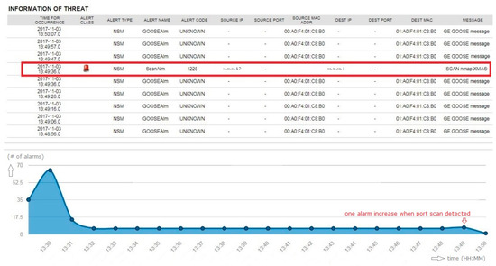 When the network mapper (NMAP) tool began operations from the test laptop, the security sensor immediately detected the alarm message shown in Figure 14. The figure shows that the NMAP scanning attempt was detected from the source IP address.