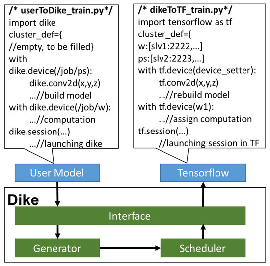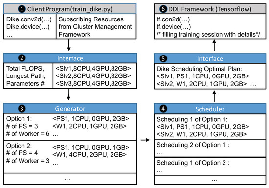 Dike’s Interface has two main responsibilities: retrieving runtime information (Figure 3, Step 2) and executing the optimal plan by launching a DDL session with resource management details (Figure 3, Step 5). Specifically, in Step 2, users will utilize Dike’s APIs to build the model as a client program. By running this program, we can capture model and training session details, including model architecture, layer types and batch size. In addition, this program would be registered on Mesos to subscribe currently available resources. These two pieces of information will be processed before feeding to Generator and Scheduler to generate an optimal resource management plan. In Step 5, after receiving an optimal plan from the Scheduler, Interface will start a Tensorflow session and fill previously user-defined model with resource assignment and task placement according to the received plan. From users’ perspective, they only need to build the model and all the resource management details are handled by Dike.