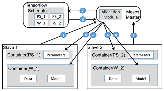 To further understand resource management process of deploying DDL, we use the following example, as shown in Figure 2, which describes typical procedures of a Tensorflow deployment on a Mesos cluster. Mesos first receives cluster configuration from all slaves in Step (1). Mesos master then offers resources to a ready-to-launch application, for instance a Tensorflow model. In Step (3), Tensorflow, after receiving the resource offers from Mesos, determines specific resource and orchestrates the placement for each task. Finally, the tasks are sent from master to each instance, either a container or a physical node, to launch the training session, as shown in Step (4). The DDL training session can be regarded as a batch processing job where, in each batch, the workers download the parameters that are shared among the parameter servers, and perform forward and backward propagation. Finally, the workers update the changes to the corresponding parameter servers.