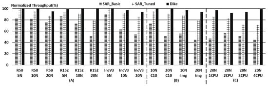 The first set of experiments focused on model difference. As shown in Figure 4A, we tested Resnet 50, Resnet 152 and Inception-v3, which approximately have 21.3 million, 64.0 million and 21.8 million parameters. The tests were run on Cifar10 dataset with 5, 10 and 20 instances. The experiment showed that Dike always achieved optimal (100%) performance on Resnet models on 5 and 10 instances. For larger scales, such as Inception-v3 with 20 instances, Dike achieved 95% of the optimal performance. The gap was caused by different placement of PS servers as Dike ran the scheduling algorithm based on profiling peer-to-peer cost, which could be slightly different in practice. The main setbacks of two SAR approaches were different: SAR_Basic ignored the differences in resource requirement between workers and slaves; and SAR_Tuned ignored co-existence of PS/worker and therefore misplaced the task locations, which further caused resource underutilization and network congestion.