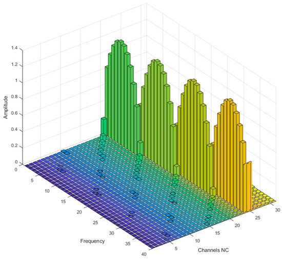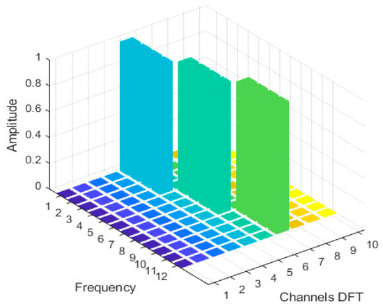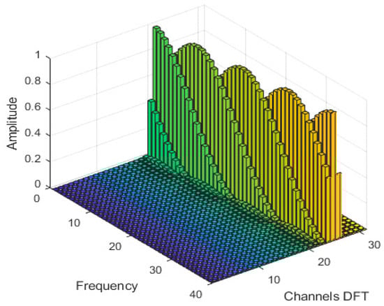 The procedure of signal spectral transformation for the DFT algorithm can be described as the procedure of dividing the signal among the frequencies of a set of bandpass filters. In the ideal case, these bandpass filters should have rectangular magnitude response with minimal overlap of adjacent channels. Figure 2 shows the magnitude response of channels with a smooth change in frequency along the frequency axis.