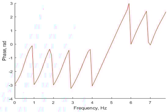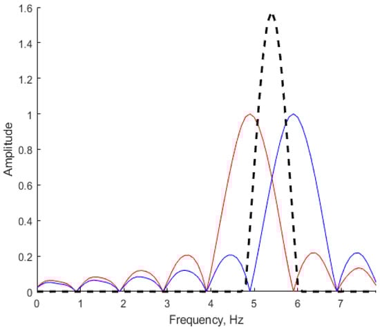 The mutually opposite direction of the “split” spectral component of the signal leads to the fact that both terms in (4) have a negative value in the overlap zone of the main adjacent lobes and positive value for all sidelobes. The difference in the sign of the product allows for the zeroing of the small values of the spectrum lateral components (Figure 7), and at the same time change the sign of the remaining component.