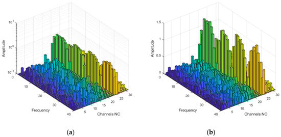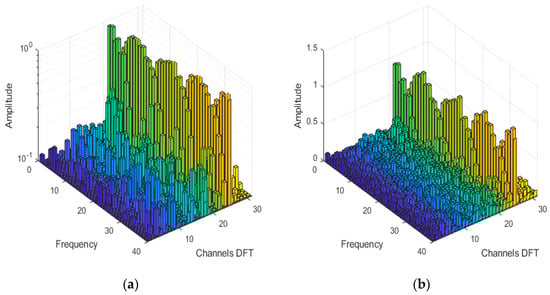 Figure 3 allows visual assessing of the Fourier transform on a finite interval. The channel DFT axis refer to the spreading of the mono-harmonic signal spectrum along the adjacent DFT channels, which is caused by the presence of sidelobes of the frequency response of the channel. One can see their level and shape along the frequency axis. Non-zero transmission coefficients in a fairly wide frequency range lead to the penetration of frequencies into adjacent channels and degrade noise filtering.