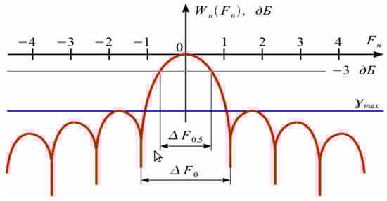 - The normalized width of the frequency response main lobe at the level of 0.5 (−3 dB) ΔF0.5.