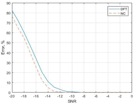 The plot in Figure 12 shows that frequency detection using NC was, on average, 5% more accurate than the standard DFT. In the range from lower −10, the NC showed a zero error, unlike the DFT. Thus, the presented method was advantageous compared to the traditional DFT.