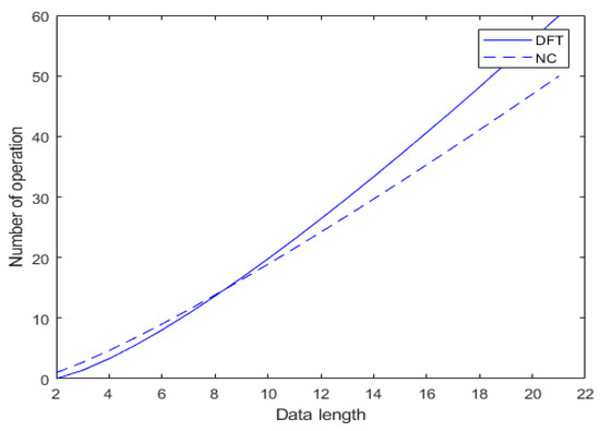 One can see from Figure 13 that with an increase in the amount of data from nine samples or more, the number of FFT operations became larger compared to the NC. This shows that for reducing computational complexity, when calculating data of nine or more samples, it is more numerically expensive to use the NC algorithm.