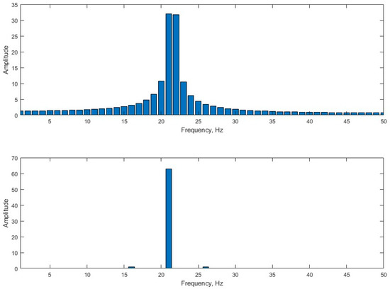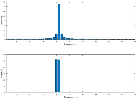 Let us consider a mono-harmonic signal with a 20.3 Hz frequency. Since the frequency had a fractional part, discrete Fourier transform had leakage of the spectrum, see Figure 14.