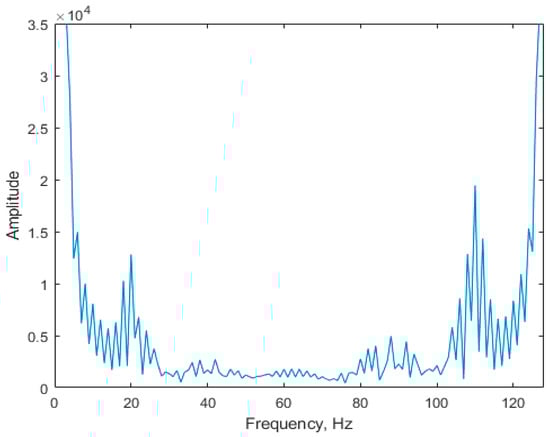 In the signal generator (Figure 21, (1)), the chirp signal is synthesized and fed to the emitting antenna (Figure 21, (2)), and the same signal is transmitted to the multiplier block (Figure 21, (4)), which multiplies the chirp signal on the received signal from the antenna (Figure 21, (3)). After multiplication, the signal is transmitted to the analog-to-digital converter (ADC) (Figure 21, (5)) and the subsequent information is processed. After the ADC, data is transferred to the fast Fourier transform block. Since the transmitter power is rather low, the signal-to-noise ratio of the received signals is quite small. The amplitude spectrum from a record of one set of points with an ADC is shown in Figure 22. Measurements were made with the Infineon 24 GHz radar kit [17].