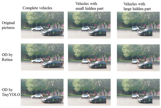 Table 1 shows the flow chart from the padding to re-detection. Because the state of the art object detection algorithms cannot detect the vehicle with hidden parts, as shown in Figure 1, we do not compare with other object detection algorithms in this section. Pictures in the first row are the padded images, which are very clear. However, the pictures in the second row are blurrier than the pictures in the first line because they are scaled down to 128 × 128 pixels. Row 3 shows the images after inpainting. The left and right inpainting are mandatory whether there are hidden parts or not. Object re-detection is shown in row 4. This is the fourth step of DIDA. If a vehicle has a hidden part, the detected region in the second stage of object detection should be bigger than the region of the first stage of detection. This is shown in the orange box in column 3 of rows 4 and 2. Otherwise, the two regions should be same, as shown in column 4 of rows 4 and 2.