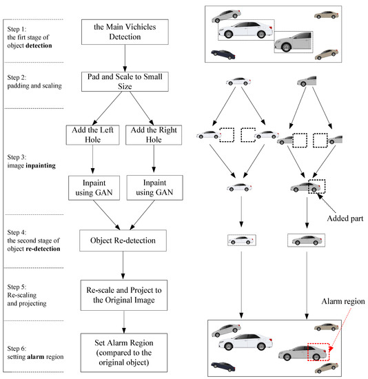The fourth step is the second stage of object detection. The inpainted images may be the same as the original image or an additional part of the vehicle added to the image. If the detected vehicle image becomes larger than the image before inpainting, this step should find the larger object box. Then, this step outputs a flag that indicates whether or not there is an alarm region.