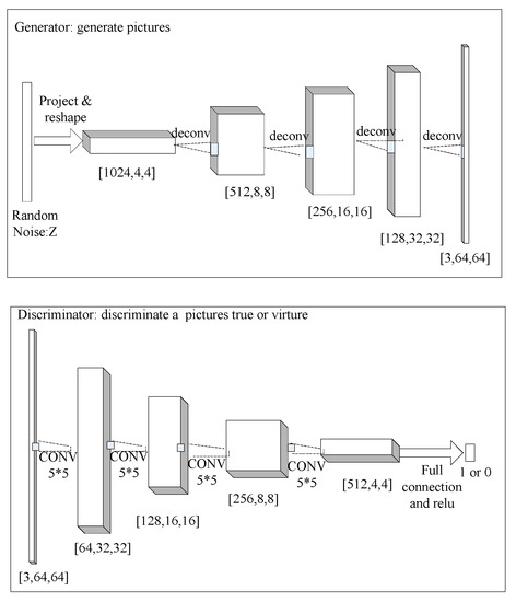 Recently, the GAN [11] has been used to generate virtual images. GAN contains two sub-models, the generator model (abbreviated as G) and the discriminator model (abbreviated as D). G generates virtual pictures, which will look like real data. Based on experience, random white noise variable z is defined as the input of G. Then, function G(z;θg) maps the noise variables to the data space. It is represented by a multilayer perceptron with parameters θg. The sub-model D is also a multilayer perceptron. D(x) represents the probability that the picture x comes from the true data rather than the virtually generated data. The framework of G and D is indicated by Figure 3.