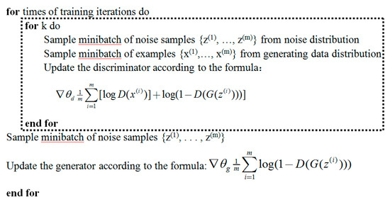 Minibatch stochastic gradient descent [37] is used in the training stage of GAN. The hyper parameter k is set as two. The k defines the times of the D for each G. The algorithm of minibatch stochastic gradient descent in the experiment is shown as Figure 4.