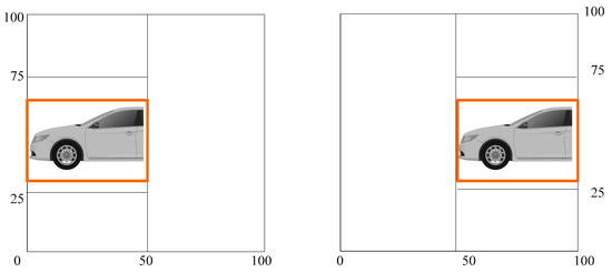 The orange box is the region of the detected vehicle. A right padding is to extend the right part and form a square image, as shown in the left sub-graph of Figure 6. A left padding is to extend the left part and form a square image, as shown in the right sub-graph of Figure 6. At this stage, the images are padded to form the complete image.