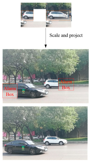 The left orange box in the top of Figure 7 shows the detected region of the vehicle before inpainting. The right orange box is the re-detected vehicle region after inpainting. The latter is bigger than the former. The difference between the two boxes is the hidden part. The vehicles are projected to the original image. The red box, the projected difference region, is defined as the alarm region (alarm box). Although the alarm area cannot be recognized as a part of the vehicle by a general vision system, this area is still dangerous. Figure 7 omits the procedure of the black car. The bottom picture is the ground-truth image.