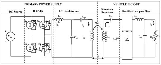 The inductive power transfer (IPT) technique is one of the most efficient near-field power transfer methods [1,2,3,4,5]. The innovation obtained a wide acceptance and research in the field is advancing in multiple directions [2,4]. Wireless charging of electronic gadgets, electric vehicles, and biomedical applications are under its control. Electric vehicles are conventionally charged through plugging in, most of the times. The invention of an efficient IPT system opens a way to charge through wireless means [6,7,8,9]. The resonance-enhanced IPT system transfers power with a higher distance than the conventional one. The challenges are wide open in charging through a viable transfer medium. The size and shape of the coil, position of the coil, and the topology of the resonance decides the power transfer efficiency [10,11,12]. In the inductive power transfer method, the power is transferred through the primary inductive coil and received in another inductive coil, called the pickup coil, separated vertically by some distance from the primary coil. The pickup coil comes under the proximity of the primary coil, an electromotive force (EMF) will be induced in the pickup coil. This high-frequency alternating voltage is fed to the battery through the rectifier and low pass filter.