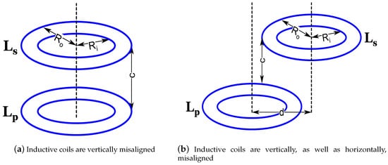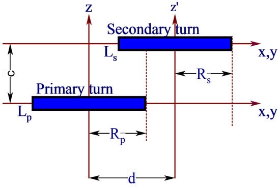 where V is the function of horizontal distance between the center of the axis d and is the function of elliptical integrals of first (K(k)) and second E(k) kind. is the radius of the single primary circular conductor and the is the radius of the single secondary circular conductor. In case there is no horizontal misalignment, then the value of V is 1. Figure 4 represents the individual turns of the inductive coil, displaced vertically as well as horizontally