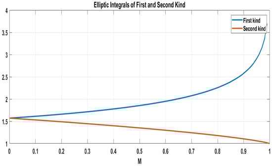 The elliptical integrals of first and second kind are plotted against m, as per (12) and (13).