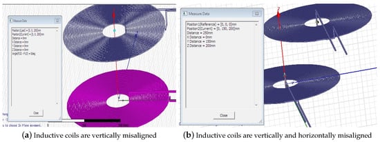 The circular pancake inductive coils, used for the IPT system, are developed in the ANSYS Maxwell simulation platform. The mutual inductances, corresponding to different misalignments, are computed by the simulation model shown in Figure 6.