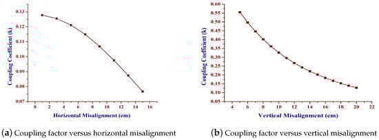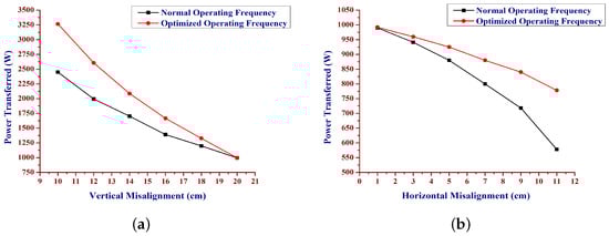 Now, the mutual inductance is the function of vertical and horizontal misalignment by Neumann’s formula, and the power transferred to the reflected load is the function of mutual inductance. Hence, the power transferred from primary to the secondary, according to the misalignment, was plotted and the improvement in power transfer level is observed in Figure 15a,b.