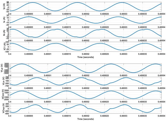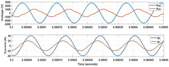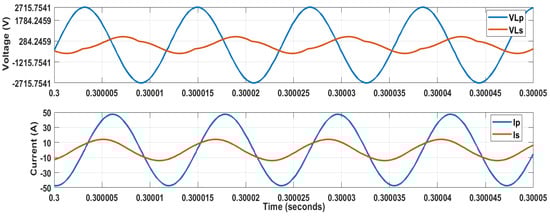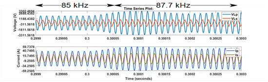 In accordance with the misalignment of the pickup coil, the mutual inductance varies. The resonance frequency depends upon the primary capacitance and primary equivalent inductance () which, in turn, depend upon the mutual inductance. An IPT system with H mutual inductance is excited with an 85 kHz operating frequency and H mutual inductance with an kHz operating frequency. The corresponding voltage and current through the primary and secondary inductive tracks was observed in the simulation and shown in Figure 10 and Figure 11.