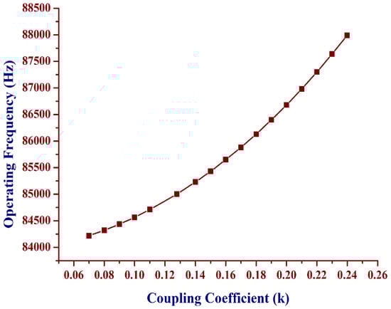 An IPT system with H mutual inductance is tuned from 85 kHz to kHz, based on the obtained frequency plot and shown in Figure 12. An increase in the magnitude of current and voltage at kHz, on the receiver side, was observed. Hence, the tuning had done its purpose completely. The operating frequency corresponding to the coupling coefficient is shown in Figure 13.