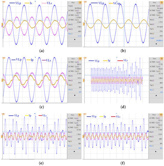 Experimental waveforms. (a) Voltage , current , and voltage . (b) Voltage and . (c) Steady state voltage and current waveform. (d) AC transients, due to horizontal misalignment. (e) AC transients, due to horizontal and vertical misalignment. (f) AC transients, due to minor perturbations ofthe coil.