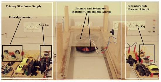 High frequency switching MOSFETs (SPW47N60C3) were used for inverting purposes, whereas high frequency diodes (MUR1560G) were used as un-controlled rectifier switches. A co-axial pancake circular coil, made of copper, was mounted on a ferrite spoke, in order to enhance the flux linkage on the pickup coil. The simulation studies were carried out with an ideal copper conductor. However, it was observed that the experimental results with ferrite spokes were closer to the simulated data. High-frequency poly-polypropylene power film capacitors were used as resonance capacitors for the system. The dynamic structure of the coils made a wide range of misalignment possible in the vertical and horizontal directions. The resistive bank, equivalent to the steady state equivalent resistance of the battery, was considered as load.