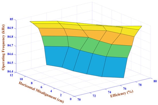 The Figure 14 shows the operating frequency corresponding to vertical and horizontal misalignment. The aforementioned data reveal the possibility of finding the resonance frequency corresponding to the physical misalignment, according to (19). In the case where the resonance frequency matches with the operating frequency, the circuit offers less impedance for the high frequency supply. This relationship was concluded analytically, and was validated through the simulation studies. Circuit parameters and values of the IPT system are mentioned in Table 1. Further, an experimental prototype was built to validate the notion in both theoretical and simulated aspects.