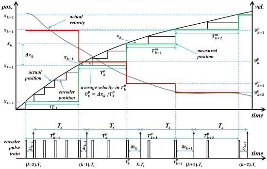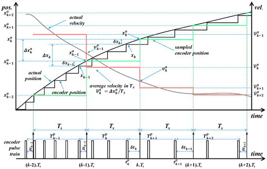 where and are the estimated velocity in the k-th sampling interval and the encoder position sampled in the k-th sampling instant, respectively. is the sampling period, and is the time elapsed between the time instant of the most recent encoder pulse in the current sampling interval () and the current sampling instant (), such that it can be calculated as (for details, see Figure 2):