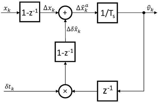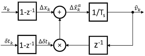 One can note that the right-hand side expression equals the simplest M method for the velocity estimation (the position change occurred in the sampling time interval Δxk divided by the sampling period ). Therefore, the proposed method can be understood as filtering the M method. However, the coefficients on the left-hand side of the expression are time-variant, since their values depend on the time instants of the encoder position pulses’ occurrence. Thus, the DLMT algorithm yields a linear time-variant discrete filter, which is of the second order; therefore, in this paper, the algorithm is abbreviated as DLMT2 (division-less MT-type algorithm of the second order). The DLMT2 filter in Equation (16) can be illustrated by the block scheme depicted by Figure 5.