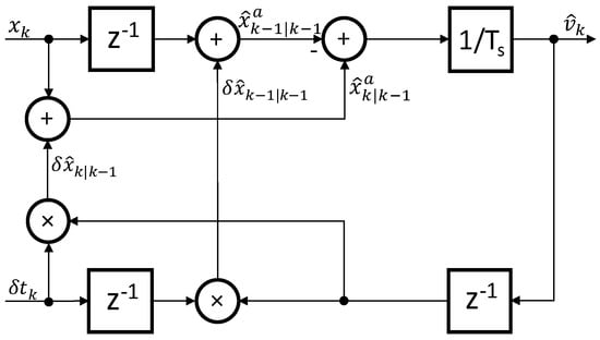 If we compare the block scheme from Figure 4 with the block scheme from Figure 6, then the higher complexity of the latter is evident. However, further analysis of the improved estimation algorithms in Equations (24)–(27) show simplification of the filter input–output structure. If we insert Equations (24) and (27) into Equation (25), then we can derive: