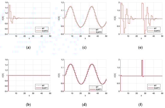 The stability analysis of the DLMT1 algorithm is significantly simplified in comparison with the DLMT2 algorithm. Since we assume , and, thus, , then the only time variable coefficient of the linear difference in Equation (29) stays bounded, since and on bounded interval for any k > 0, where we denoted . Therefore, the stability proof is rather simple (please see the preliminaries of the stability analysis in []). If we introduce the auxiliary input variable , then the response of the linear time-variant filter of the first order (29) can be derived as a unique solution that yields: