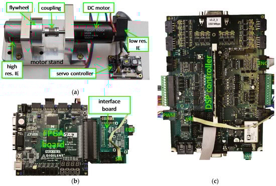 The main components of the experimental setup: (a) The mechanical servo drive system; the processing hardware electronics with (b) The FPGA board, and (c) The DSP controller.