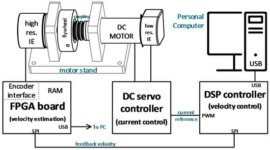 The experimental setup consists mainly of the mechanical drive system with the rotary Incremental Encoder (IE), and the processing hardware electronics. The mechanical drive system consists of a DC motor Maxon RE 35 with low-resolution Incremental Encoder HEDS 5540 (with 500 line counts per turn), mounted on the rear side of the motor shaft, and a high-resolution rotary Incremental Encoder Heidenhain ROD 1020 (with 3600 line counts per turn) is linked to the front side of the motor shaft. The latter was used for the experimental evaluation and validation of the considered methods for velocity estimation. The motor shaft and the high-resolution IE shaft are interconnected mechanically by a metal bellows coupling. Additionally, we attached a rotational flywheel on the encoder shaft, in order to reduce mechanical oscillations with increased rotational inertia. The DC motor was driven electrically by a Maxon ESCON 36/2 DC Servo Controller configured in the current control mode. The reference value for the current control loop was provided by the processor-based controller with the microcontroller TI DSP TMS320F28335, which implemented a simple velocity control loop with the PI control algorithm. The value of the control output was transferred to the Maxon servo controller via the PWM signal with the switching frequency of 5 kHz. The reference velocity was generated internally on the DSP controller, while the feedback velocity signal was provided by the testing IE, which was connected electrically to the Digilent Nexys2 FPGA board [] via a custom interface board on the high-speed expansion connector. The interface board contains standard RS 422 line receivers, proper analog filters, and line termination. Capturing of the encoder pulses was performed by the FPGA circuit (Xilinx Spartan XC3S1200E) at 125 MHz (clock resolution of 8 ns). The sampling frequency was 10 kHz. The update of the velocity estimation output was performed synchronously with the sampling. The proposed division-less MT-type velocity estimation algorithm of the first order from Figure 7 was implemented on the FPGA board in a fixed-point format. The calculation scheme was performed by integer arithmetic operations, and executed in only a few FPGA clock cycles (less than 100 ns) with minimal resource consumption. The data required for the velocity control loop were transmitted to the DSP controller via SPI communication in real time in every sampling period. These data were the estimation values for the feedback velocity obtained by the proposed algorithm implemented on the FPGA board, and the other data required for velocity estimation by other algorithms and methods for comparison purpose. The online computation on the DSP controller was performed in real time in single precision floating-point format. The bidirectional full-duplex SPI communication enabled the data transfer from the DSP controller on the FPGA board simultaneously. The data were logged in the RAM on the FPGA board in real time, in order to be transferred later to the desktop computer for offline post-processing. The desktop computer was connected to the FPGA board by a USB communication link. We performed data post-processing offline in double precision floating-point format. Some more detailed information of the experimental system can be found in []. However, one should note that the current experimental system is an upgraded version of the previous one, with the following main differences. (a) We replaced the DC motor with a larger version in order to reduce mechanical oscillations. (b) The servo controller was configured in the current control mode. (c) We added the DSP controller, which performed the velocity control loop and other computations (the reference trajectory and alternative velocity estimation algorithms for comparison purposes). (d) The FPGA implemented the proposed division-less algorithm of the first order. The main components of the system are shown by Figure 9, whereas the experimental system scheme is presented by Figure 10.