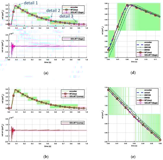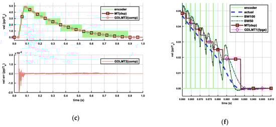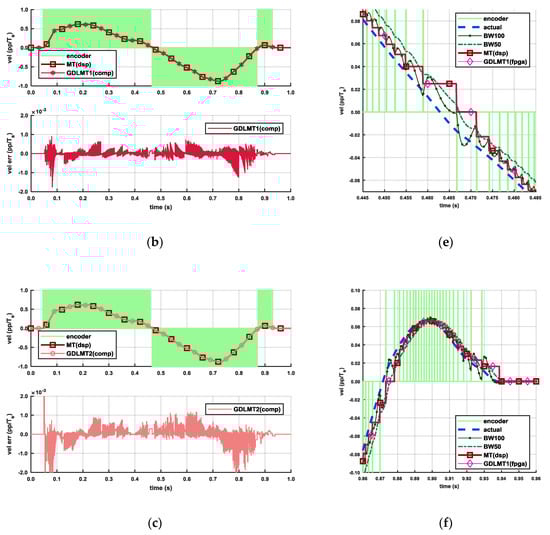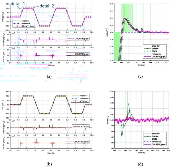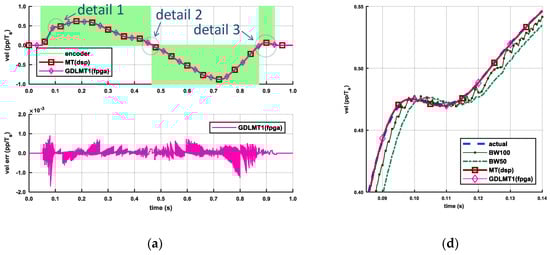 Figure 13 illustrates the experimental results with the trapezoidal velocity profile of relatively high set point speed (10 pp/Ts), which were obtained by the motor-driven configuration. The servo drive system was configured in velocity closed-loop control with the testing IE for velocity feedback. Diagram Figure 13a depicts the results with the GDLMT1 algorithm implemented on the FPGA, whereas diagram Figure 13b depicts the results with the MT velocity computed on the DSP. The upper plots show the encoder velocity, the reference velocity, and the feedback velocity. Both plots demonstrate good matching of the feedback velocity with the reference velocity. The middle plots show the control error, i.e., the difference between the reference velocity and the feedback velocity. The control errors are almost the same. The bottom plot in diagram Figure 13a shows the velocity error of the used feedback velocity, i.e., obtained by the GDLMT1 algorithm on the FPGA, and the plot in diagram Figure 13b shows the velocity error of the GDLMT2 velocity computed offline. By comparison of these plots, we can observe a larger error in the case of the GDLMT2 velocity. Diagrams Figure 13c,d show details 1 and 2, respectively, from diagram Figure 13a. Detail 1 illustrates the overshoot of when the actual velocity converged to the set point speed, whereas detail 2 focuses on the traveling phase. We can record an overshoot of 0.1 pp/Ts, pretty smooth velocity in the transient phase, a small ripple of magnitude of 0.005 pp/Ts in the case of the GDMLT1 velocity due to the mechanical noise, and larger fluctuation of the velocity obtained by the filtering method (at BW50, and even more distinctive at BW100) caused by alternation of the encoder pulses.