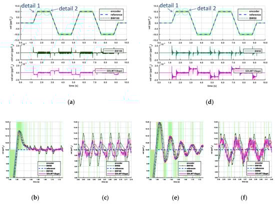 We then repeated the experiment; however, we changed the feedback velocity. Instead of the MT-type velocity, we applied the velocity signal obtained by the Butterworth filter (the filtered M method velocity). The control loop remained tuned as it was in Figure 13. The results are depicted by Figure 14: diagrams (a)–(c) show the case with the BW100 velocity, whereas diagrams (d)–(f) show the case with the BW50 velocity. More specifically, diagrams Figure 14a,d depict the reference velocity profile, along with the encoder velocity and the feedback velocity on the upper plots, the control error on the middle plots, and the difference between the reference velocity and the GDLMT1 velocity on the bottom plots. The “big picture” illustrated by the upper plots hides the details; however, it is easy to observe the permanent noise of the encoder velocity. The control error reveals a relatively high ripple in the case of the BW100 velocity, which is also demonstrated on the GDLMT1 velocity error on the plot below. In the case of the BW50 velocity, one can see more oscillations in the transient phase. Details 1 and 2 from diagram Figure 14a are illustrated by the plots Figure 14b,c, respectively. The overshoot of ca. 0.14 pp/Ts can be noted in Figure 14a, which is 40% more than in the case with the GDLMT1 feedback velocity in Figure 13c. Furthermore, a large ripple is evident, not only in the BW100 velocity, but also in the GDLMT1 velocity. If we consider that the GDLMT1 velocity is close to the actual velocity, then we can deduce that this could be the true velocity. Thus, the ripple is caused by the BW100 velocity used in the feedback control. Details 1 and 2 from diagram Figure 14d that are shown in the plots Figure 14e,f somehow confirm the observations from the “big picture” for the BW50 velocity case, which include: i) relatively large oscillations in the transient phase with an overshoot of ca. 0.20 pp/Ts (100% more than in the case with the GDLMT1 feedback velocity), which relates to lower stability of the control loop (a result of a worse phase margin due to the lower cut-off frequency), and ii) a large ripple during the traveling phase. Thus, although the BW50 velocity was smoother than the BW100 velocity, its application in the feedback deteriorated the system output response further.