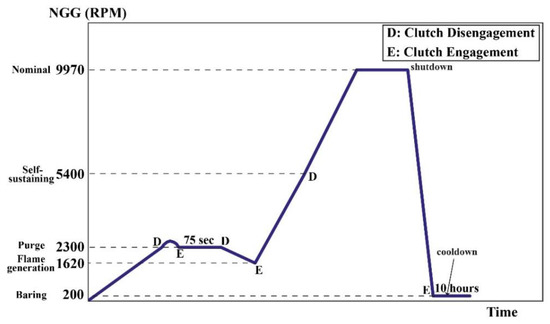 As can be seen in Figure 6, after starting, the clutch is engaged and the starter increases GG speed up to 2300 rpm. The starter remains at the same speed from this point and the clutch is in D state. However, due to the rotor inertia force, NGG slightly increases (it experiences a jump) and then returns to 2300 rpm once more such that the clutch is put in E state. The starter and GG rotate with each other for 75 s until the gas turbine is purged (freeing any left gas). After 75 s, the clutch reaches D state so that the flame can be created, preventing it from being put out by air speed. Once NGG reaches 1620 rpm, the flame is created and the clutch turns into E state again. From this moment on, the starter and CC (combustion chamber) cooperatively increase NGG. Once the speed get to the self-sustaining stage, the clutch will be in D state, after which CC increases NGG up to working rpm. After the operation of gas turbine for the desired amount of time, the shutdown command arrives at the motor and the starter is turned on (200 rpm). GG rpm decreases after shutting down until it hits 200 rpm.