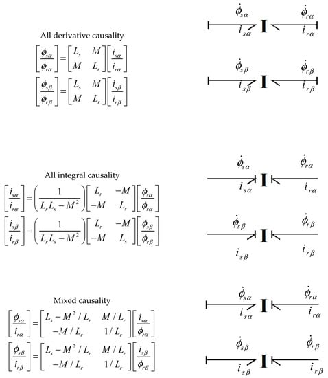 which seem more complicated than Equations (1)–(5). The introduction of some ancillary parameters may simplify this issue. In the case the current sources drive the motor model instead of voltage sources, the number of state variables dictated by causality is only three. This implies that except using instead of , the consequent equations would be similar to Equations (2)–(5) and the mixed causality previously displayed in Figure 9 is a suitable option.