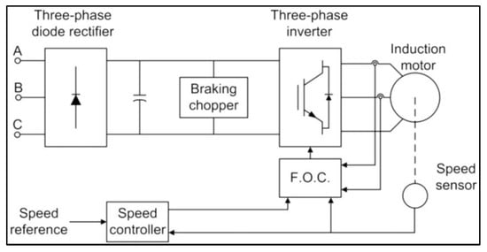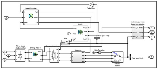 The main components of the drive include three-phase diode rectifier for generation of desired AC voltage, DC link, DC link chopper, three-phase inverter for generation of AC voltage with suitable amplitude and frequency for supplying the induction motor, and breaking chopper for controlling the DC link with capacitor energy difference in resistance when the acceleration is negative or the loading torque accelerates the motor. Speed sensors and controller, along with current sensor and drive controller system are based on the field oriented control (F.O.C). SFC drive structure is shown in Figure 11. The designed drive that is connected to three-phase electrical grid with an effective voltage of 400 V and frequency of 50 Hz controls the induction motor. Figure 12 displays the internal structure of the drive used in simulation which was designed in Matlab/Simulink.