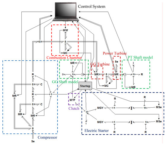 - Montazeri-Gh, M.; Miran Fashandi, S.A. Bond graph modeling of a jet engine with electric starter. Proc. Inst. Mech. Eng. Part G J. Aerosp. Eng. 2018. [Google Scholar] [CrossRef]