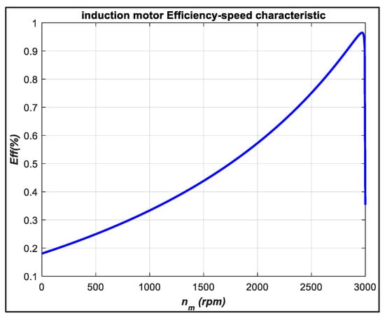 As obvious in Figure 14, the increase in the rotor resistance also increases the starting torque, while reducing the speed at which the maximum torque occurs. Figure 15 shows the variations of induction motor efficiency with respect to speed. As can be noticed, the highest efficiency of the machine happens to be around the synchronous speed.