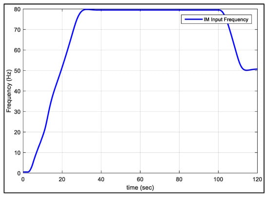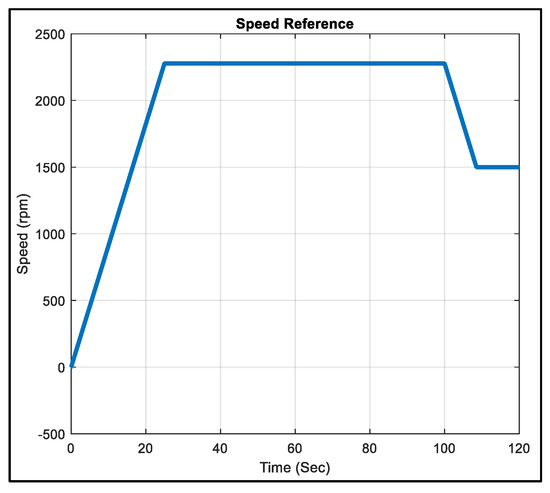 According to Figure 16, the speed reference has four parts. In the first part, the speed increases with constant acceleration and reaches 2278 rpm at t = 25 s. Then, it remains constant for 75 s, after which the motor speed decreases for around 8.5 s and reaches the constant velocity of 1500 rpm at which it continues its operation. Table 5 shows the properties of the used drive.